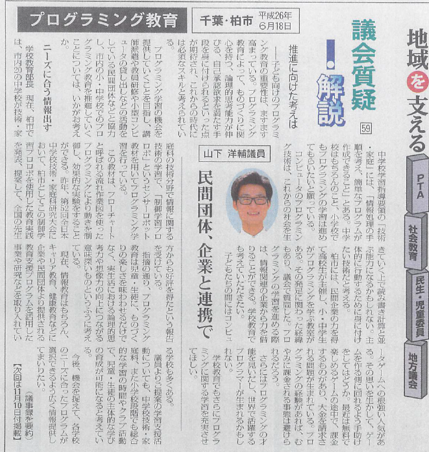 日本教育新聞に取り上げて頂きました 議会質疑 プログラミング教育 プログラミング教育日本教育新聞 第5986号 平成26(2014)年10月27日 日本教育新聞 第5986号 平成26(2014)年10月27日 に、プログラミング教育についての質問を掲載して頂きました。 投稿者: 山下 洋輔 千葉県議会議員(柏市選出)。 元高校教諭。理想の学校を設立したいと大学院に進学。教員経験、教育学研究や地域活動から、教育は、学校だけの課題ではなく、家庭・地域・社会と学校が支え合うべきものと考え、「教育のまち」を目指し活動。著書『地域の力を引き出す学びの方程式』 2011年から柏市議会議員を3期10年を経て、柏市長選に挑戦(43,834票)。落選後の2年間、シリコンバレーのベンチャー企業Fractaの政策企画部長として公民連携によってAIで水道管を救う仕事を経験。 柏まちなかカレッジ学長/(社)305Basketball監事。 千葉県立東葛飾高校卒業。早稲田大学教育学部卒。 早稲田大学大学院教育学研究科修士課程修了後、土浦日大高校にて高校教諭。早稲田大学教育学研究科後期博士課程単位取得後退学。 家族 妻、長男(2014年生まれ)、長女(2017年生まれ) 山下 洋輔 の投稿をすべて表示